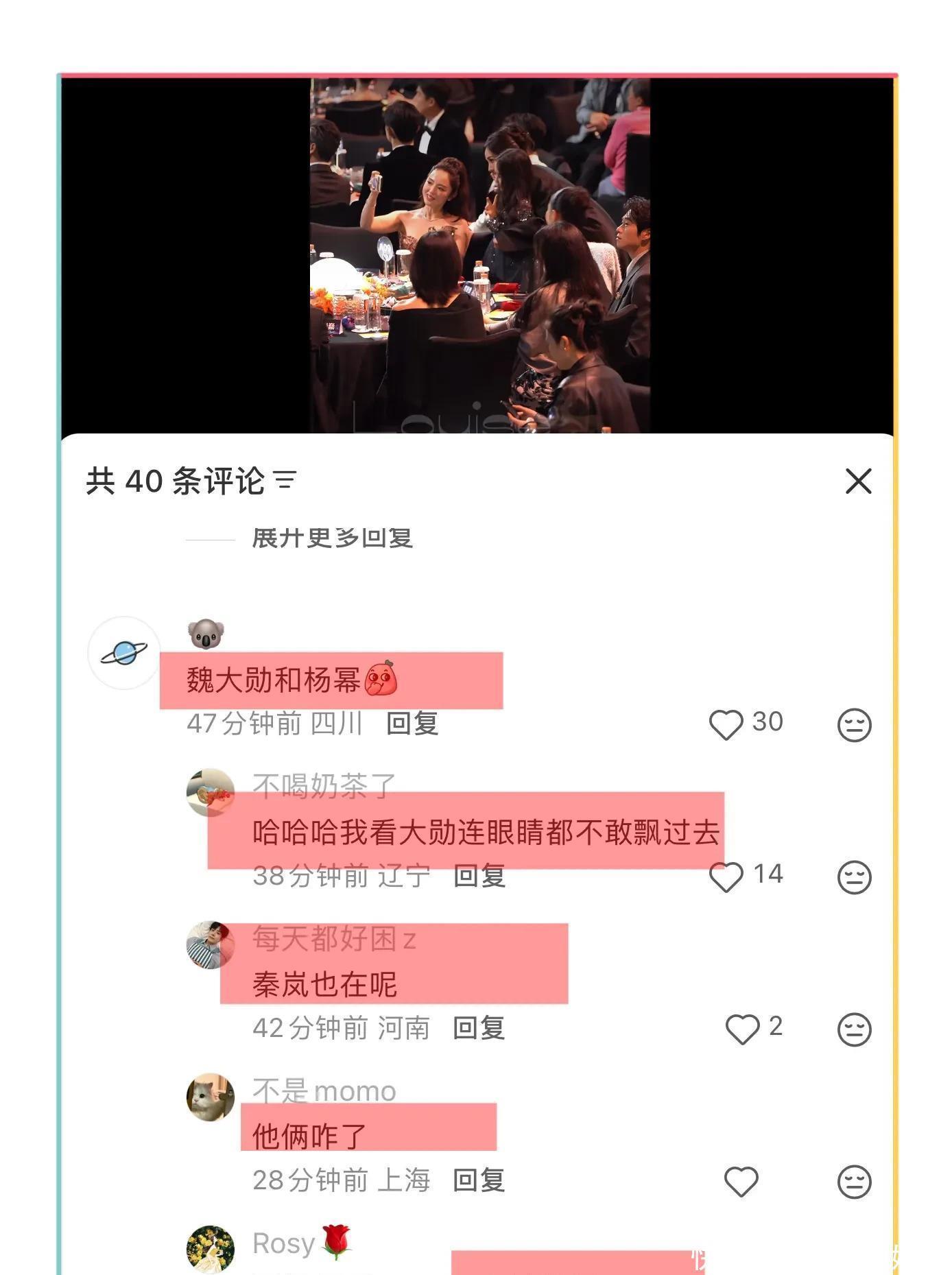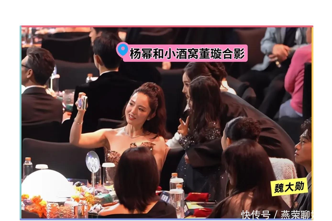 紧接着还有更有意思的事,杨幂去邻桌跟小酒窝董璇合影,不得不说小酒窝确实人见人爱,加上杨幂爸妈跟董璇爸妈关系很好,所以杨幂跟董璇小酒窝也很熟,尴尬的一幕又发生了,杨幂搂着小酒窝,小酒窝左手边是佟丽娅,佟丽娅旁边是魏大勋,网友说魏大勋的表情很不自然,眼神都不敢动,生怕跟杨幂对视的感觉,之前两个人关系很好,被拍到一同逛街吃冰淇淋,疑似谈恋爱,不过两个人没有官宣,后来魏大勋和秦岚恋情曝光!