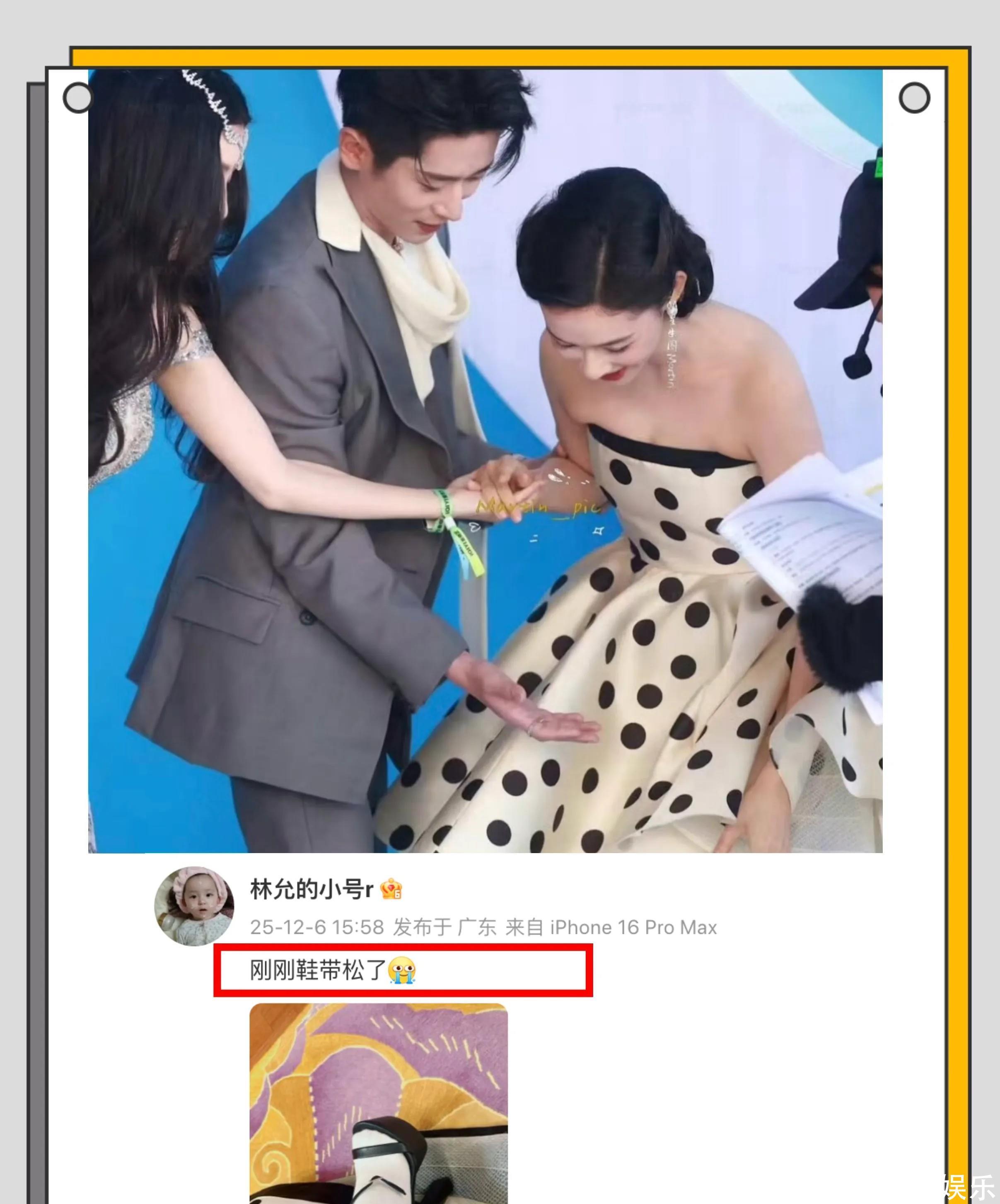 红毯上林允鞋带开了,由于鞋跟太高,直接摔倒,幸好旁边的丞磊快速把她扶起来,不过也很尴尬!